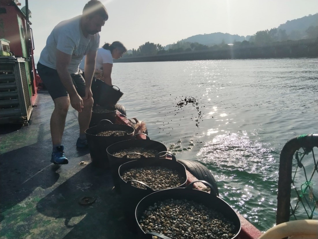 Se han sembrado desde la embarcación de Lonxa de Campelo AIE, de la que es partícipe esta cofradía, un total 833.000 uds de almeja japonesa de una talla entre los 15 y 18 mm, con el objetivo de fortalecer el reemplazo de stock de almeja perdido por las lluvias y caída de salinidad del otoño pasado. El total de unidades suponen en kilos un total de 567 Kg y sirve como refuerzo de las tareas de regeneración que el colectivo del marisqueo a pie lleva realizando a lo largo del presente ejercicio.